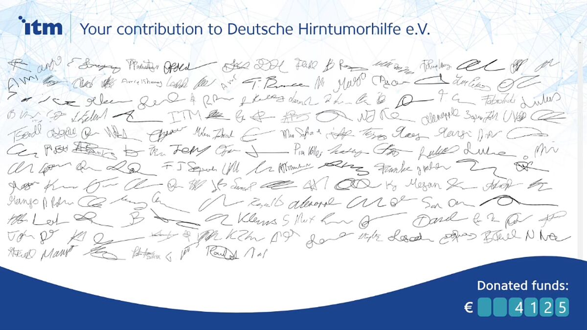 We would like to extend our heartfelt thanks to all the visitors at our booth who signed our Signature Wall to raise donations for the Deutsche Hirntumorhilfe e.V. We are pleased to announce that we are rounding up the total donation amount to €5,000!